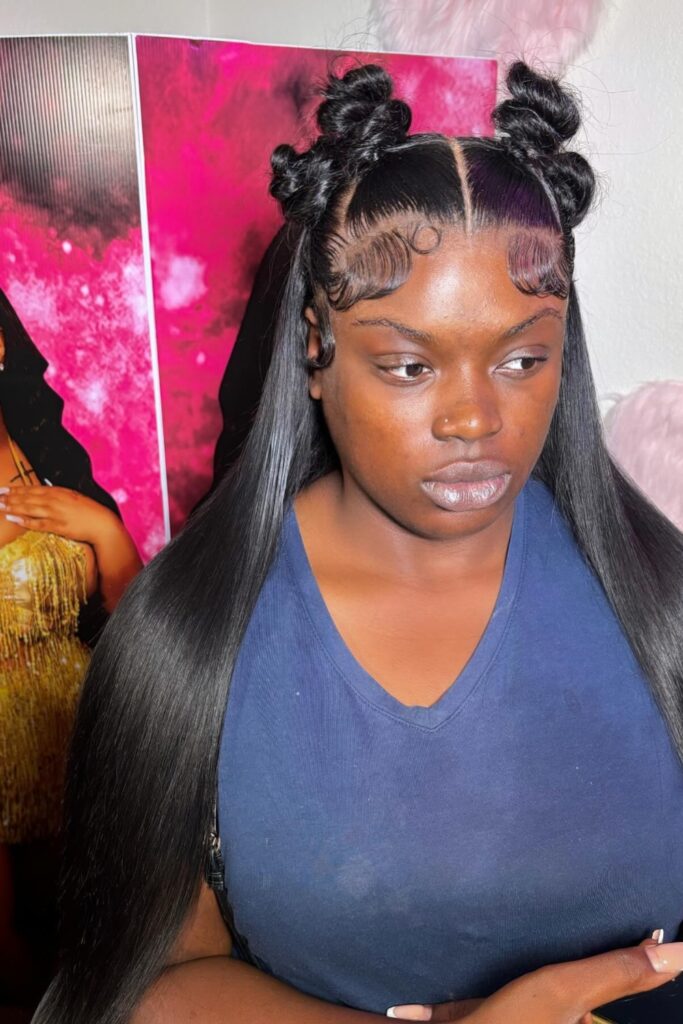This style is highlighted by two playful buns atop the head, adding a youthful and trendy element.