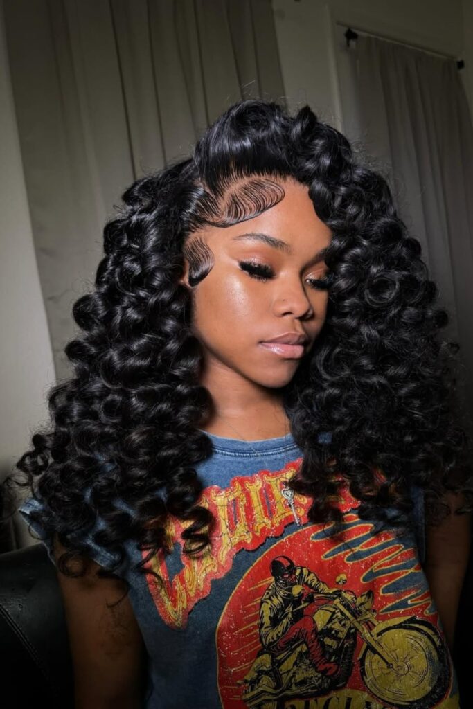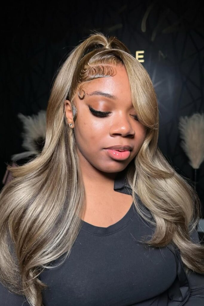 Wave Swoop Elegance features a blend of soft waves and intricate baby hair artistry, emphasizing the forehead with a creative touch.