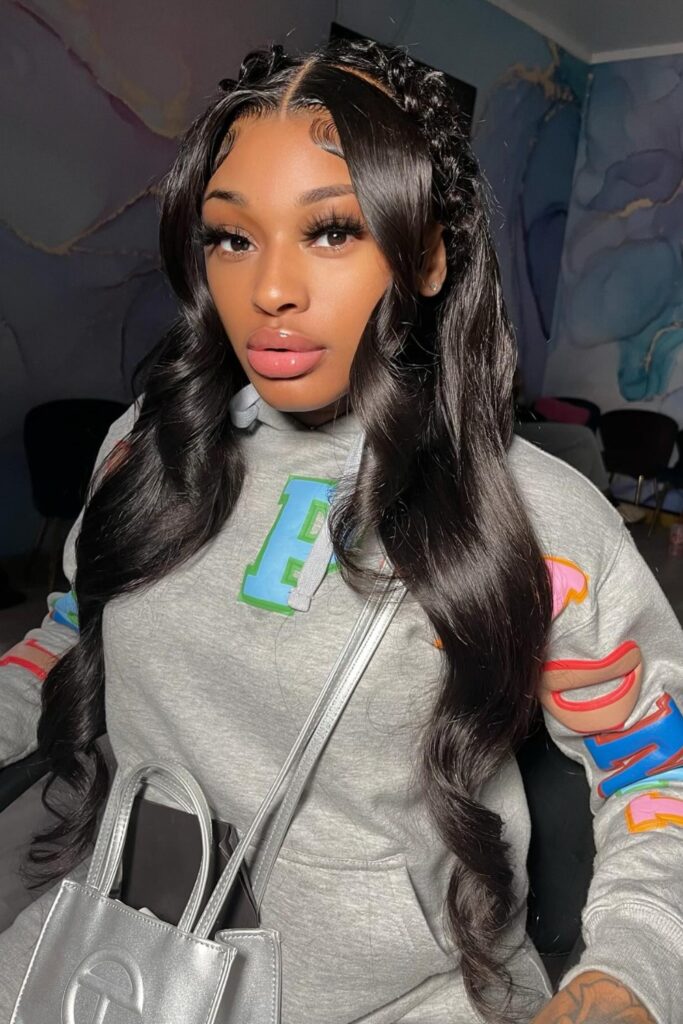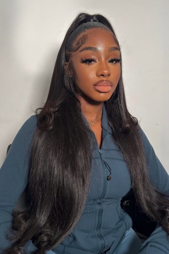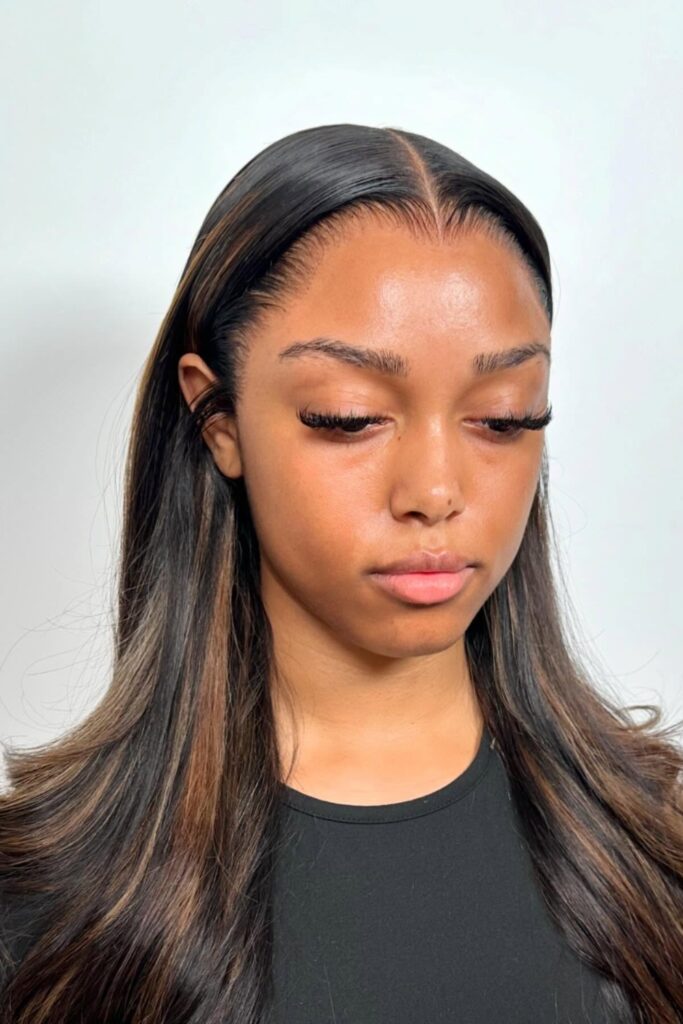The hairstyle includes subtle baby hair accents along a cleanly parted hairline, adding to its polished appearance.
