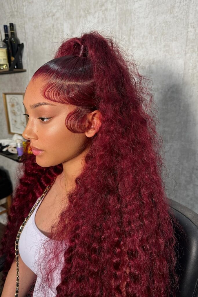 This look features a deep burgundy shade, providing a vibrant contrast to traditional hair colors.
