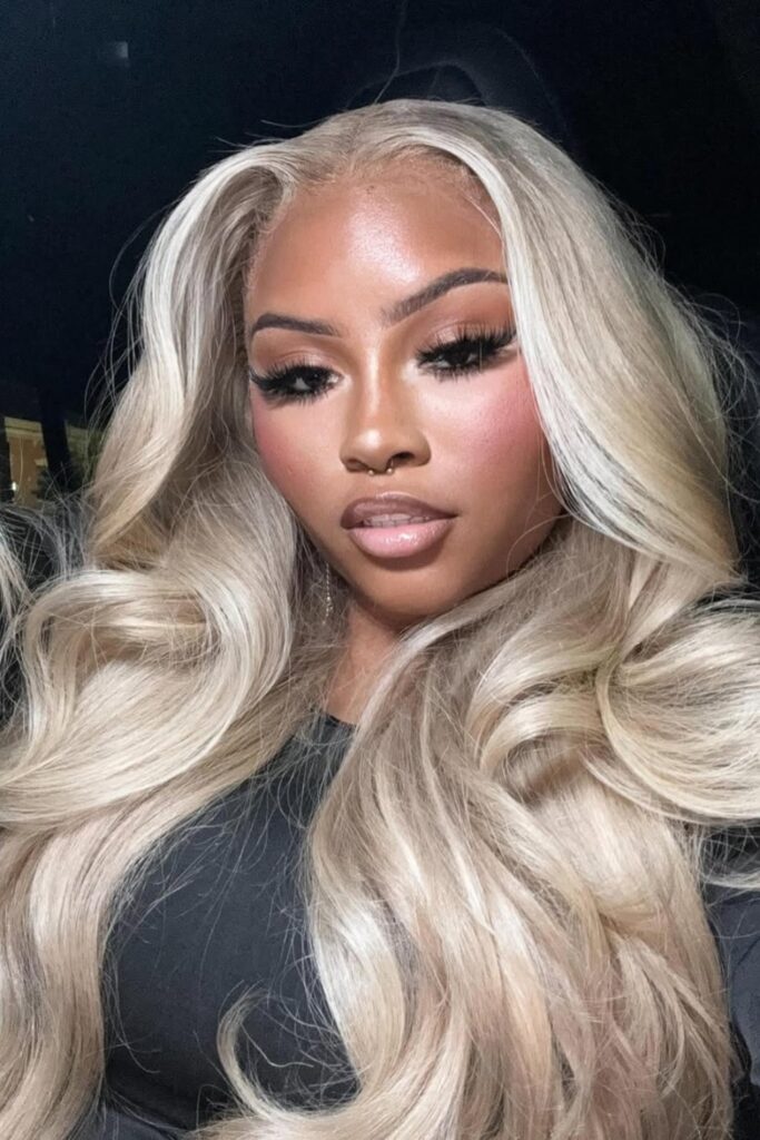 Platinum Waves presents an eye-catching look with its bright, platinum blonde color and luxurious, voluminous waves.